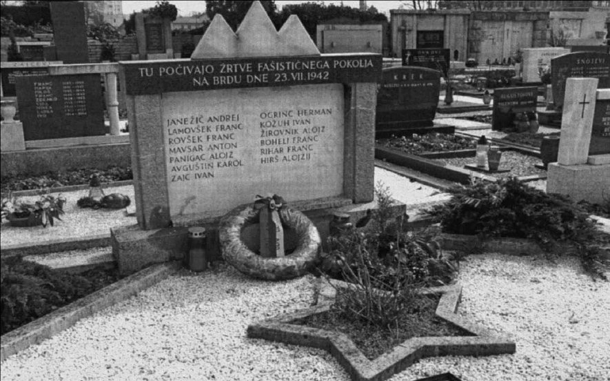 Grob žrtev skvadristične represalije na pokopališču na Brdu pri Ljubljani 26. 7. 1942. Oddelek fašistične milice je na Brdu v maščevanje za dva italijanska grenardirja, ki sta bila ubita na Vrhovcih 22. 7. 1942, naslednji dan na Brdu ustrelil 14 moških in 2 ženski ter požgal 25 hiš. - Zbirka »Diego de Henriquez«, Trst